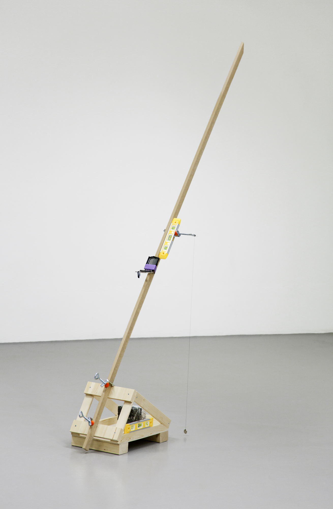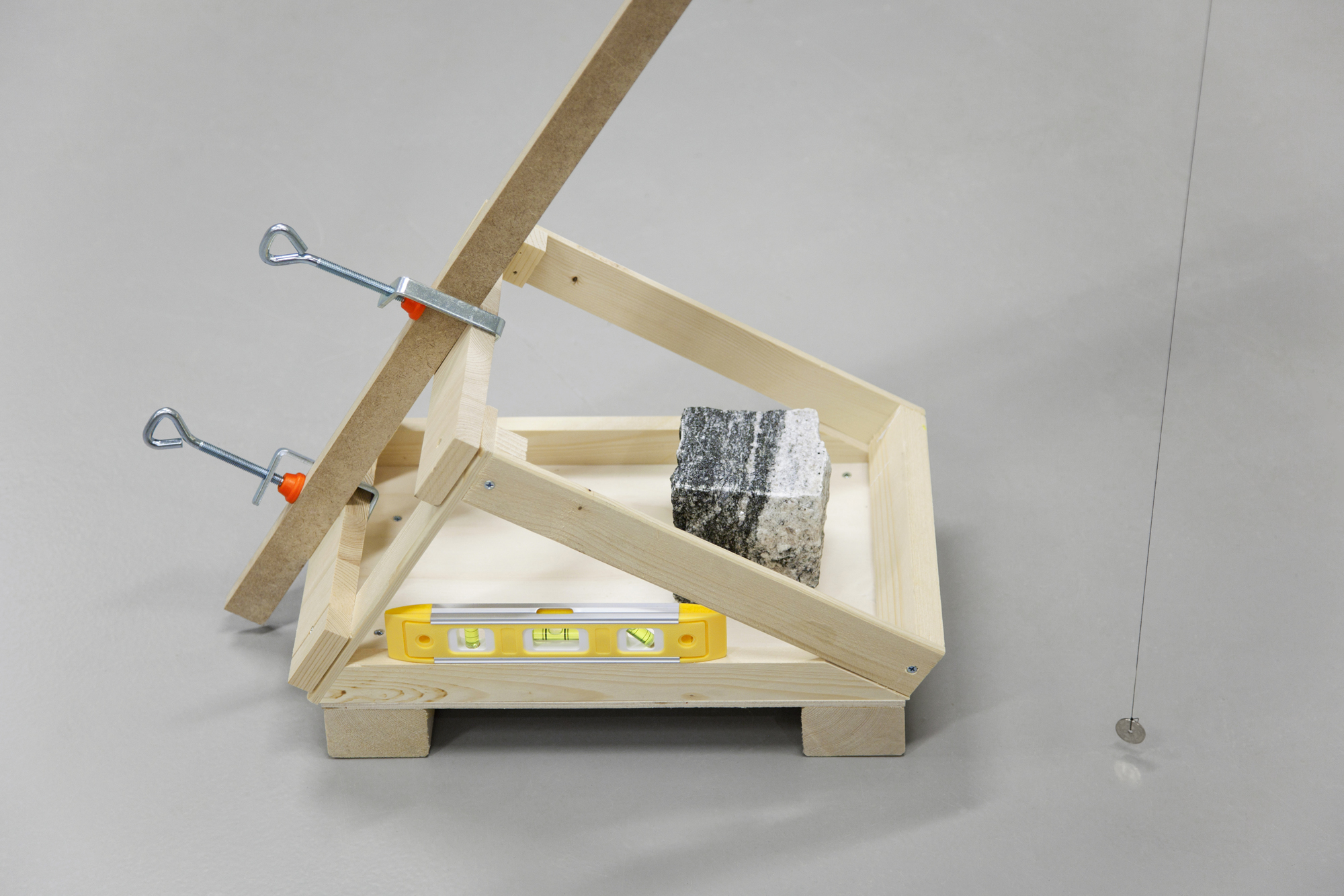 Wood, MDF, compass, spirit levels, clamps, granite block, coin, string, masking tape